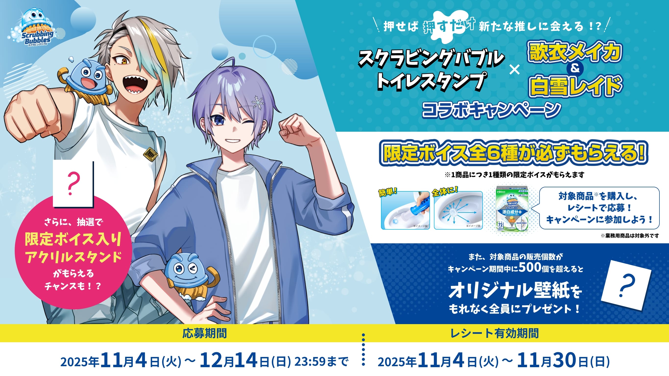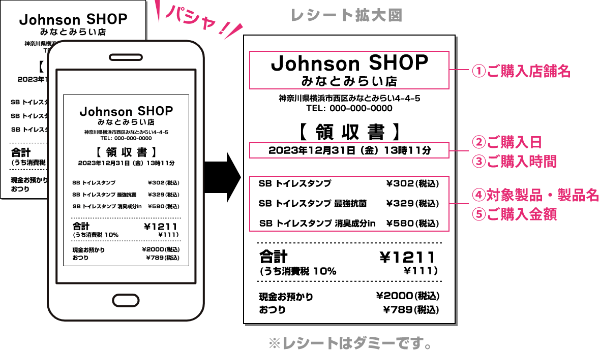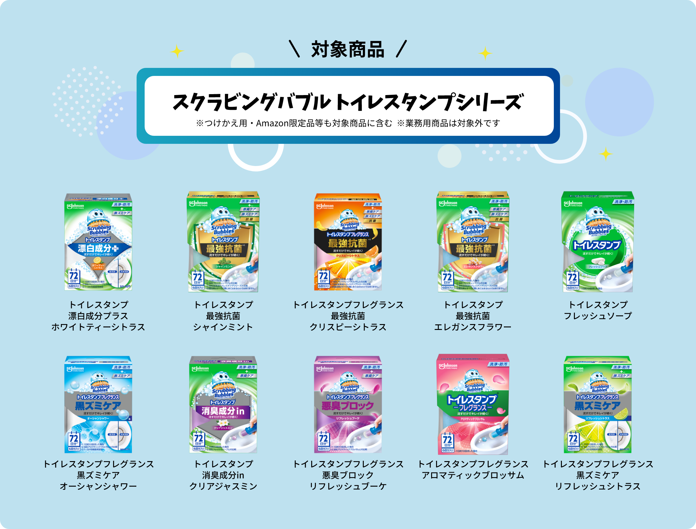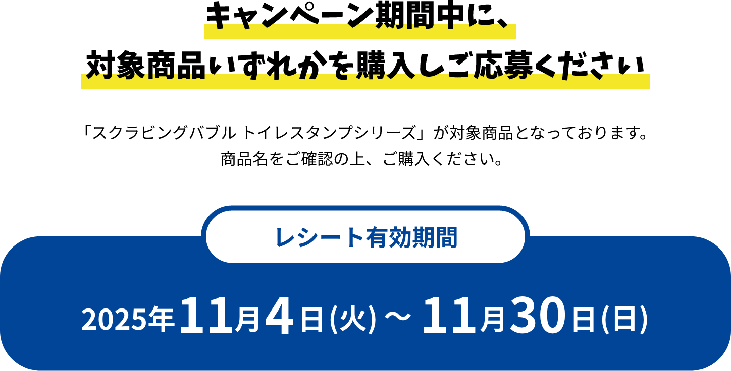 ・スクラビングバブル トイレスタンプシリーズを実店舗にて1点以上ご購入のレシートを送付された方が対象となります。 ・スクラビングバブル トイレスタンプシリーズ1点につき1種のボイスデータが付与されます。 ・レシートは必要事項がはっきり見えるよう撮影してください。 ・レシートに①ご購入店舗名 ②ご購入日 ③ご購入時間 ④対象商品・製品名 ⑤ご購入金額が確認できない場合、ご応募が無効になる場合があります。