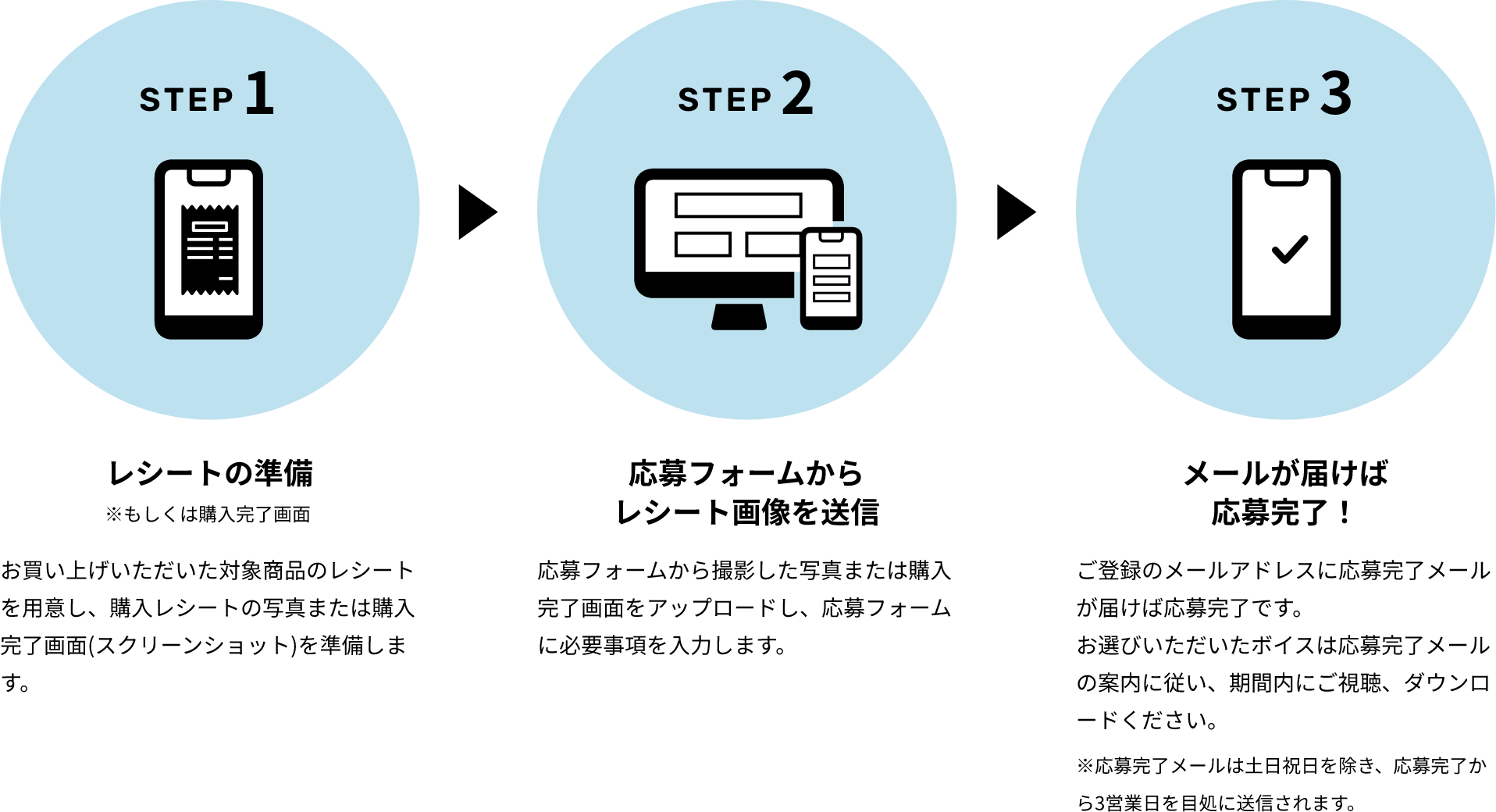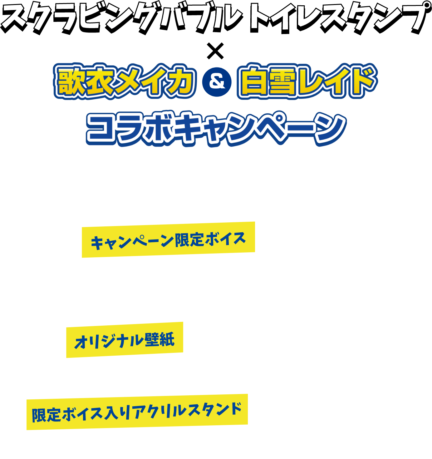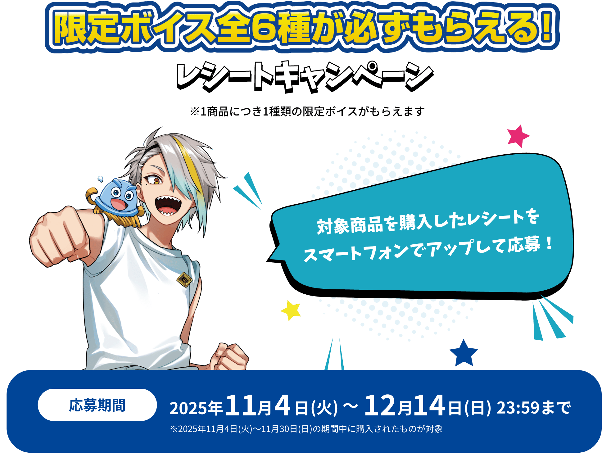 ・スクラビングバブル トイレスタンプシリーズを実店舗にて1点以上ご購入のレシートを送付された方が対象となります。 ・スクラビングバブル トイレスタンプシリーズ1点につき1種のボイスデータが付与されます。 ・レシートは必要事項がはっきり見えるよう撮影してください。 ・レシートに①ご購入店舗名 ②ご購入日 ③ご購入時間 ④対象商品・製品名 ⑤ご購入金額が確認できない場合、ご応募が無効になる場合があります。