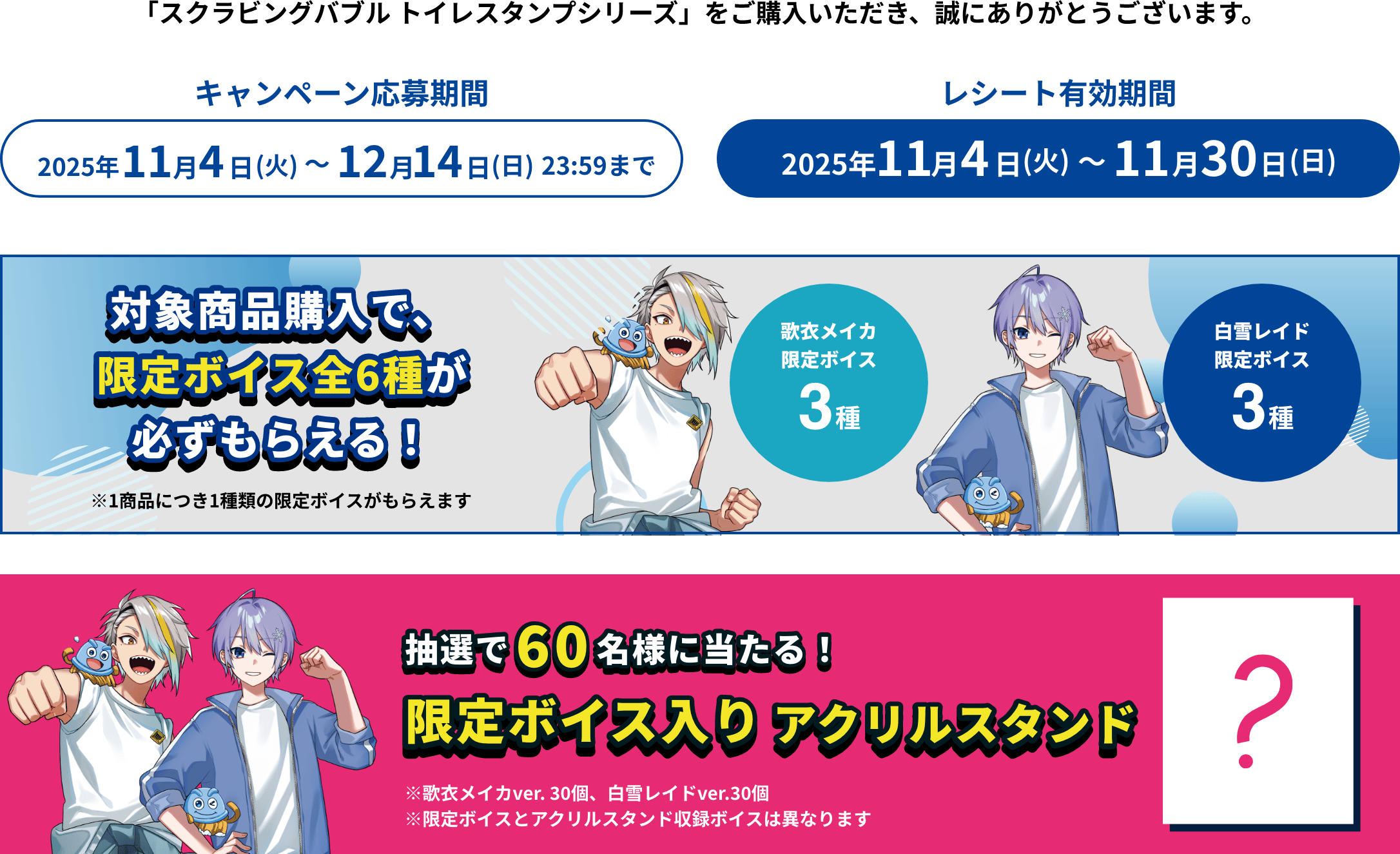 対象期間中に「スクラビングバブル トイレスタンプシリーズ」を1点以上ご購入いただいた方 ※オンラインショップでのご購入(Amazon限定品等も含む)・つけかえ用も対象です。 ※業務用商品は対象外です。